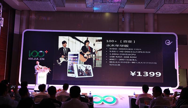 2013年6月20日,百分之百公司联合中国电信、百度公司,在广州威斯汀酒店举办“百变青春 个性生活–100+个性定制手机发布会暨100+水木年华联合品牌手机发布会”. 在此次发布会上,基于C2B模式定制的全球首款100+个性定制手机–“百变”手机正式发布。与此同时,百分之百公司还携手着名音乐创作组合水木年华,发布了“100+水木年华”联合品牌手机。